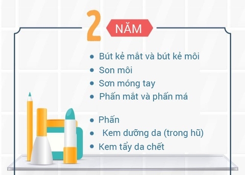 Bút kẻ mắt và kẻ môi cũng như mỹ phẩm dạng bột, phấn bắt đầu mất hiệu quả và có thể bị bở. Kem dưỡng ẩm và tẩy da chết có thể gây kích ứng da do sự phát triển của vi khuẩn tích tụ trong sản phẩm. Bạn đừng quên làm sạch miếng bọt biển thường xuyên để kéo dài tuổi thọ của phấn trang điểm.